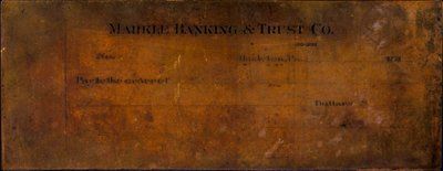 191-. 227x88x1mm copper plate. Markle Banking & Trust Co., for 1910's date period, some typical toning from age and handling. The bank was founded in Hazleton Pa. in 1910 and was prominent in the Pennsylvania anthracite coal business. VF condition.
