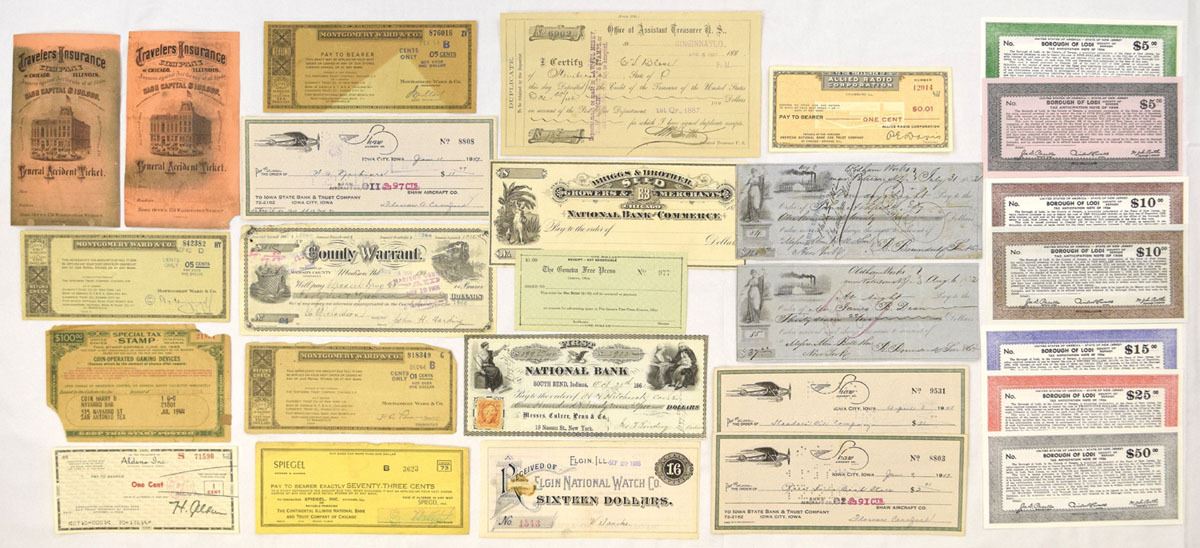 Various States..., 1850s-19040s. Lot of 27 Issued checks, warrants, refund checks, insurance tickets, tax anticipation notes, and related financial documents, Includes examples from Montgomery Ward & Co.; National Bank; National Bank of Commerce; Elgin National Watch Co.; Shaw Aircraft Co.; Travelers Insurance Co.; Allied Radio Corp.; Iowa State Bank & Trust Co.; Borough of Lodi, New Jersey tax anticipation notes; County Warrants; and others. Designs feature allegorical figures, locomotives, aircraft, agricultural and industrial scenes, engraved borders, municipal seals, and revenue stamps, including a $100 Special Tax Stamp for Coin-Operated Gaming Devices. Condition ranges from Good to Very Fine overall, with folds, edge wear, punch cancellations, and typical banking markings. (27). Sold “AS IS” no returns accepted.
