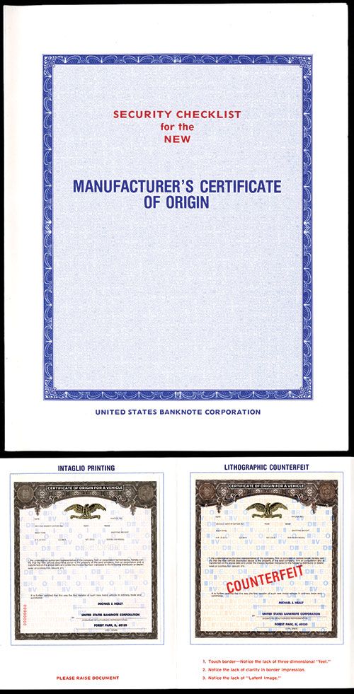 ND, ca. 1970's, Pamphlet with 3 versions of Certificate of Origin for a Vehicle certificates, an original engraved version, Lithographic counterfeit and Xerox Color copy for comparison, New condition, Rare counterfeit information item. USBNC.