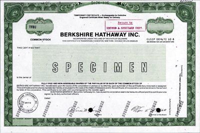 1973. Odd Shs. Specimen Temporary Certificate. Class B Common Stock. Green border. Facsimile signature of Warren Buffett signature. Rare certificate. ABNC.