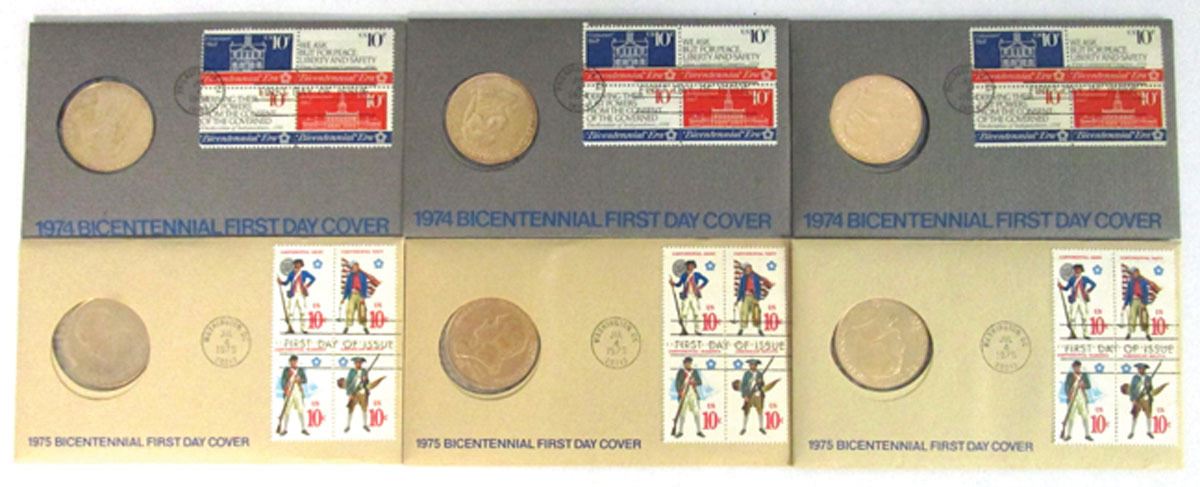 Washington D.C., 1974 & 1975. Lot of 6 Bicentennial First Day Covers: 1974 Commemorative Medal Depicting John Adams (3) and 1975 Commemorative Medal depicting Paul Revere (3). Coins come in their original packaging and envelopes with First Day stamps. (6).