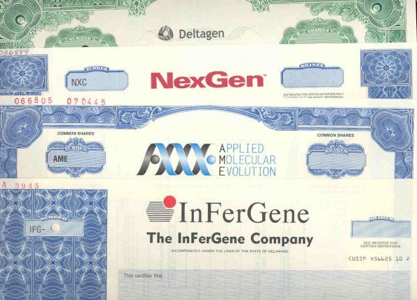 ca.1980's-90's. 5 different specimens. Companies include: Genentech Inc., Sepragen Corp., Genzyme Corp., InFerGene Co., Applied Molecular Evolution Inc., NexGen Inc., Deltagen Inc. All are scarce and many have never been seen before. All have a variety of vignettes, shares, share class, colors and various printing companies. All in XF condition.
