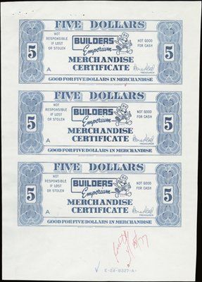 1977. P-Unlisted. $1; $5. Proof, Specimen. Archival production file for Builders Emporium Scrip notes. 1) $1.00 approval proof sheet of 3 printed on white paper with large margins. Initialed on bottom right and dated in red. Green note with goofy beaver vignettes. 2) $5.00 approval proof sheet of 3 printed on white paper with large margins. Initialed on bottom right and dated in red. Blue note with goofy beaver vignette. 3)-4) Sheet of paper with $1.00, orange and $5.00, brown specimens stapled on to it with notations on paper. 5) Order form for scrip notes-merchandise certificates included. 2 sheets of 3 of each proof were in archive. Rare modern merchant scrip. SC-USBN. Unc.