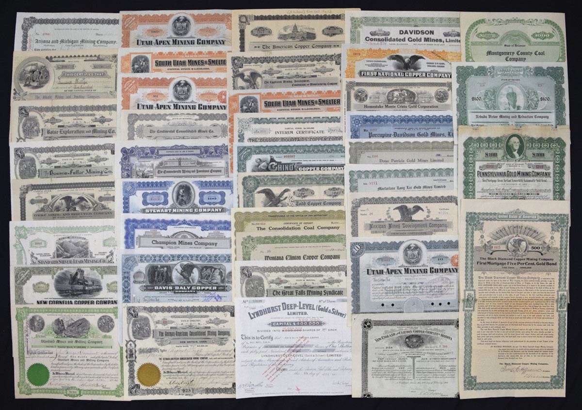 Lot of 40 Mining Related Stocks and Bonds from Mexico, Canada, England, and the United States includes: Mexican Mines Development Co.; MacFarlane Long Lac Gold Mines Ltd.; Dona Patricia Gold Mines Ltd.; Lyndhurst Deep-Level Gold & Silver Ltd.; Davis-Daly Copper Co.; Chino Copper Co.; Bullion Mountains Copper Co.; South Utah Mines & Smelters; Black Diamond Copper Mining Co.; and, more. Certificates range from VF to AU condition. (40). Sold "AS IS" no returns accepted.
