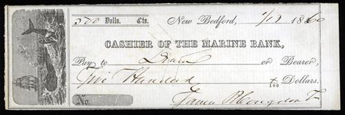 New Bedford, Massachusetts, 1860, $500, Issued and cut cancelled check, black with no underprint, Whaling scene on the left counterfoil area, XF condition, Rare whaling related check.