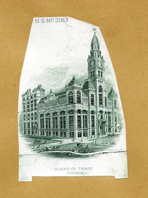 ca.1880-1890's. Proof vignette of the Board of Trade building in Chicago. Printed on india paper in green and mounted on manila file folder. Unique in archive. Plate was evidently broken when the vignette was printed. Choice condition. WBNC.