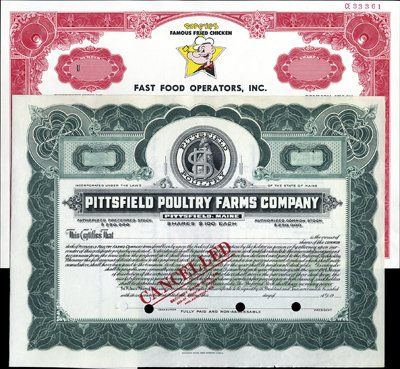 ca.1914; 1984. Odd Shs. 3 different specimen stocks. 1, 2). Pittsfield Poultry Farms Co, orange or green borders. Both with rooster with "$" sign in front of it; 3). Popeye's Famous Fried Chicken - Fast Food Operators, Inc. with colorful "Popeye" vignette in middle and Popeye holding sign as undertint. Don't be a chicken - bid on this. SBNC, SCBNC.