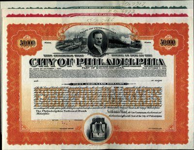 Pennsylvania. ca.1922-24. $100; $1000; $10,000; $50,000. 9 different specimen bonds of various colors, denominations and loan types. All have vignette of moustached man flanked by harbor scene and train on elevated tracks. With Liberty Bell on bottom. All are in XF condition. POC's. Scarce group. SBNC.