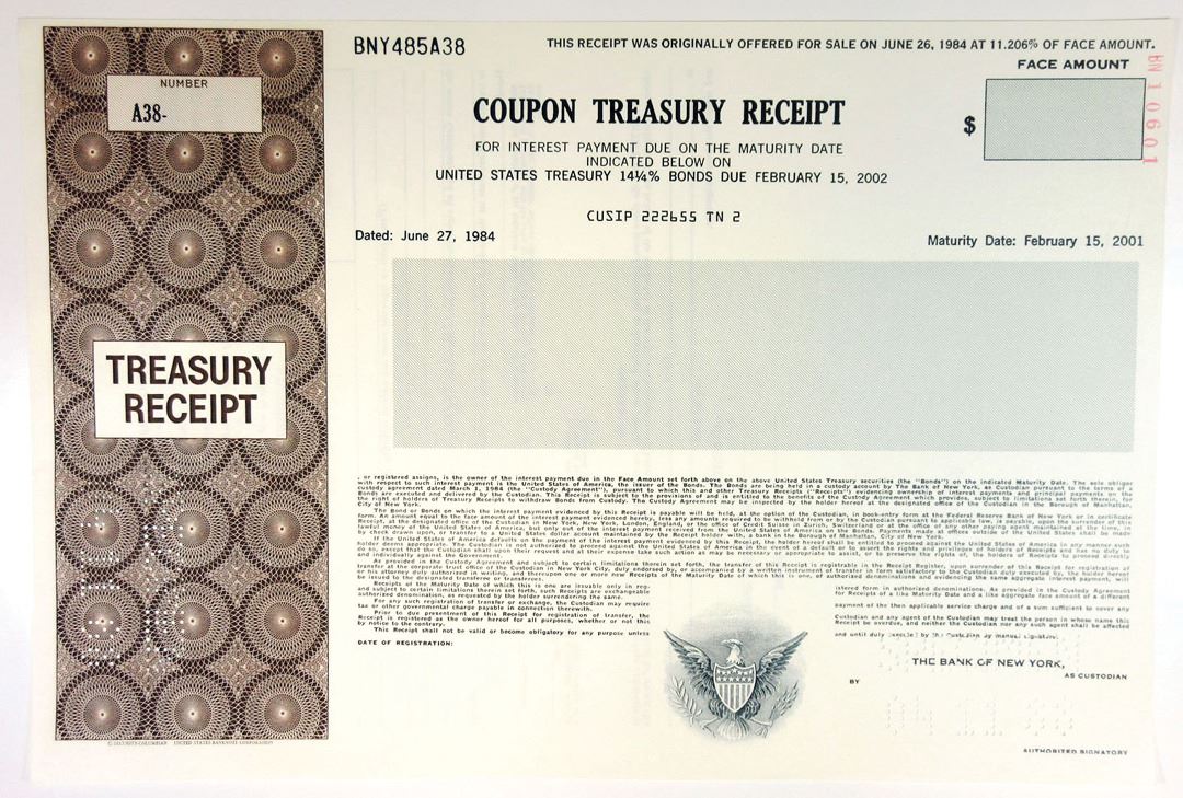 Washington, D.C., U.S. Coupon Treasury Receipt Specimen 14 1/4% 1988 $-Odd. U.S. Federal Government Related Bond. Intaglio printed U.S. Bald eagle with shield on bottom. Brown, XF, SC-USBN.