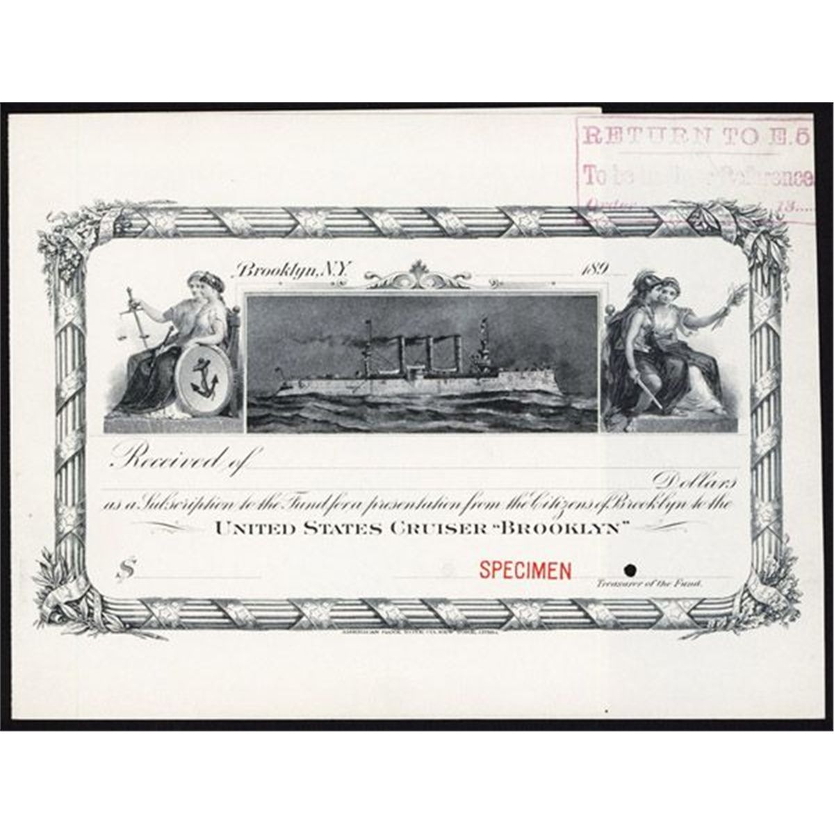 Brooklyn, New York. 189x, United States Cruiser “Brooklyn” donation or Gift certificate, ornate border with portrait of the cruiser in middle flanked by allegorical women, Specimen overprint, POC's. Counterfoil attached, Archival overprint on top right, XF condition. ABNC.