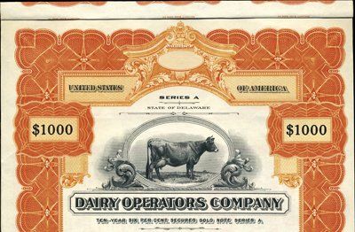 1931. $50; $100; $500; $1000. 4 different specimen bonds of the same company in different colors and bond denominations. All have a great vignette of a dairy cow "utterly" ready to be milked. All in choice condition. All with coupons. Red specimen overprints and POC's. Scarce group. SBNC.