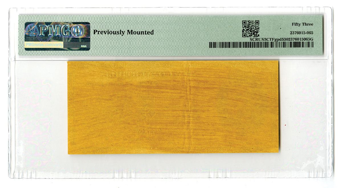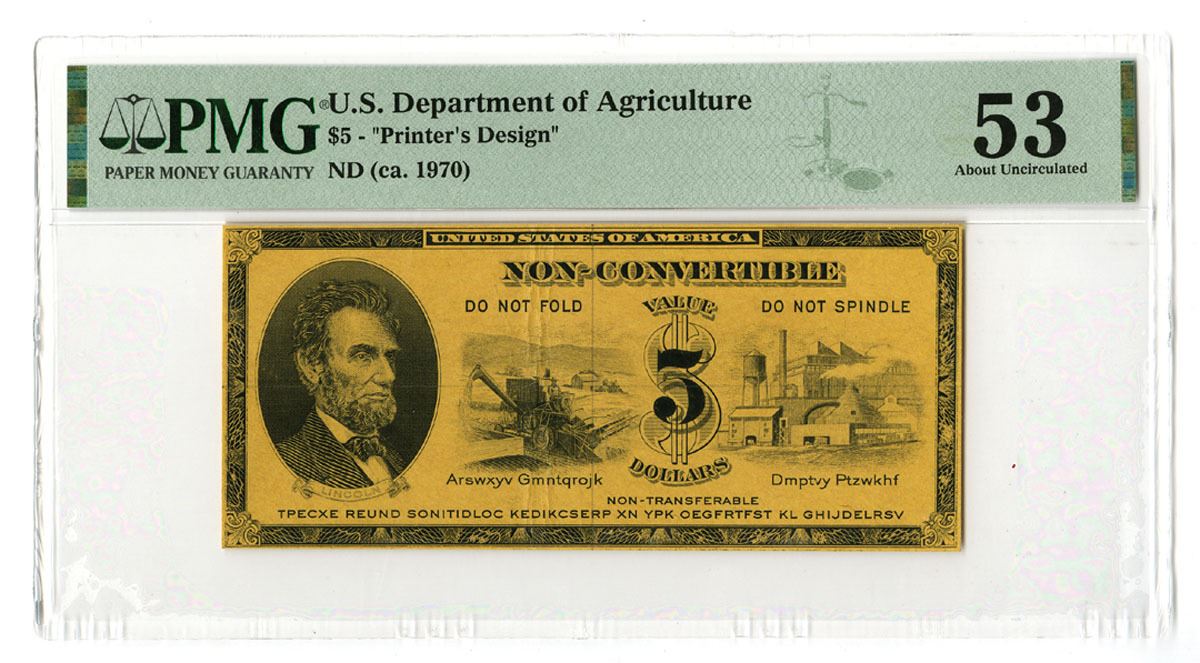 Washington, D.C., ND (ca.1970). $5 Printer's Design for a Coupon or Certificate, Black print on yellow/brown paper with portrait of Lincoln at left and farming equipment and facility at right, Text at bottom is in gibberish, PMG graded About Uncirculated 53 with comment "Previously Mounted."