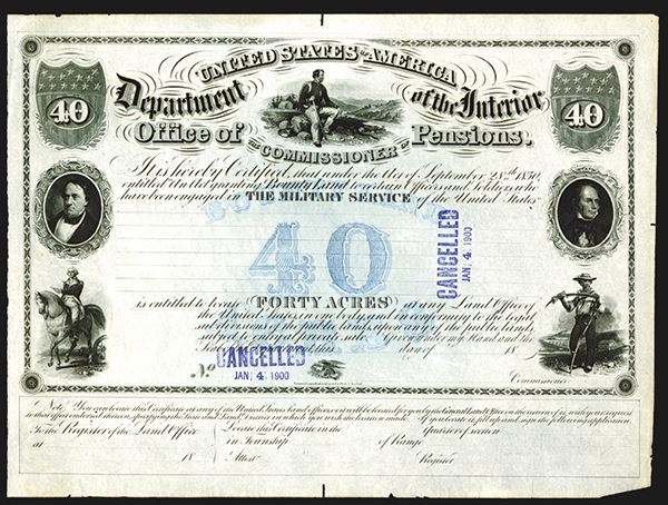 Washington, D.C., U.S., ND ca.1850's, Unissued and ink cancelled, Office of the Commissioner of Pensions certificate for 40 acres of land for soldier who engaged in military service of the U.S., Black with blue undertint, Washington on horseback LL, reaper on LR, seated soldier holding cane top middle with portraits on left and right, Cancelled 1900, AU condition, TCC & Co., Scarce in any form and first time seen by cataloger unissued.