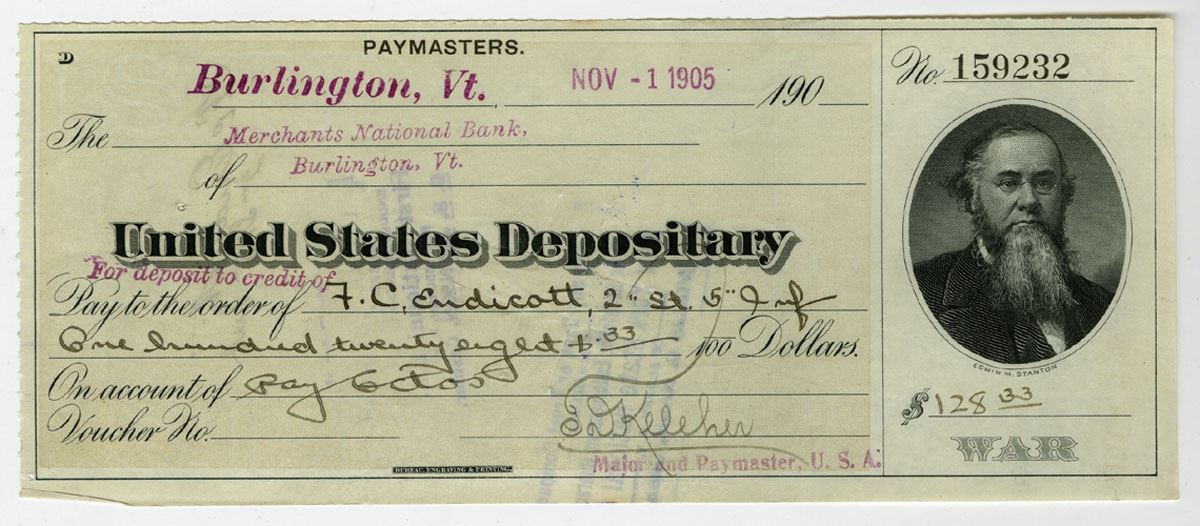 Burlington, Vermont, 1905. I/C United States Depositary Check from the Merchants National Bank, Burlington, VT., to F. C. Endicott, for $128.33, Signed by the Major and Paymaster. Black text with purple overprints, Edwin M. Stanton depicted at right with "WAR" in text underneath. XF-Unc. condition. Bureau, Engraving & Printing, BEP.
