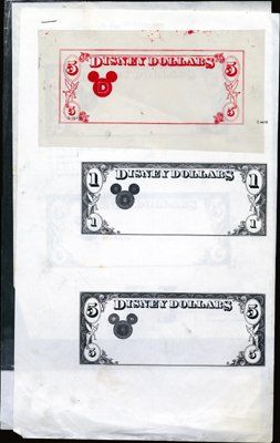 1987-88. $1; $5 2 different photo proofs printed on clear film in red as an overlay to evaluate designs. Also includes correspondence relating to this issue. The 45 is mounted to a paper sheet with photo copies of the $1 and $5 notes. The $1 proof is in a plastic holder to protect it. Rare group of Disney Dollar production material. Choice condition.