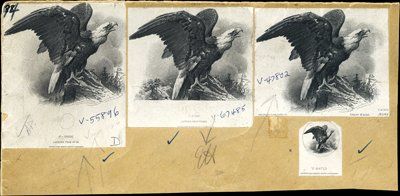 ca.1850's-1880's. 11 different vignettes of small to large format patriotic eagles. The vignettes range from 1 to 4 inches in size. All are printed on india paper mounted on manila card. Printers include ABNC (10) and CBNC (1). There are 2 sets of eagle, one with 6 vignettes and the other with 3 vignettes, that have the same eagle with variations of back ground, frames or background designs. The balance of the vignettes are all different. Titles include "Great Eagle"; "The Eagle"; "On the Cliff"; "Eagle's Nest" and untitled. All are vignettes of famous images. Condition ranges from VG (with handling and small tears and paper chips) to choice uncirculated condition. Please inspect. Rare vignettes of famous eagle vignettes. ABNC, CBNC.