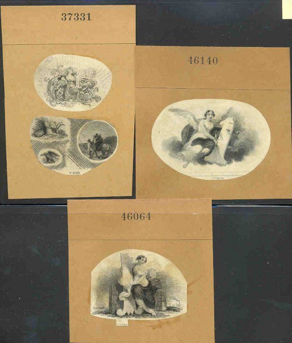 1840-1850's. 9 different vignettes of allegorical figures, angels, cherubs, farmers and Native Americans with the numeral "1". 2 are compound proofs with multiple vignettes. 3 are printed by BB&Co. and 6 are unattributed but are by earlier printing firms. All are printed on india paper and mounted on manila card with plate number at top of the card and on the india paper. All are cut down large die proofs. Some have light foxing or glue staining but overall a choice group. Please inspect. Rare group of early vignettes.