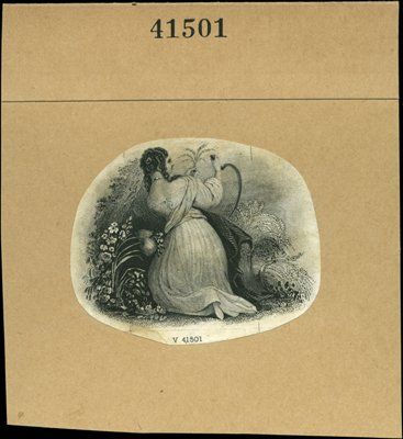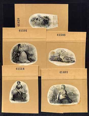 1840-1850s. Proof. 5 different proof vignettes of allegorical women. One is titled "No.2 The reaper", the rest are untitled. All of the images are of women "reapers" with grain in various poses and different backgrounds. All are printed by either TC&C, DW&Co., BC&Co. and others early firms. All are printed on india paper and mounted on manila card with plate number at top of the card and on the india paper. All are cut down large die proofs. All have very slight foxing or glue staining except 1 with heavier staining and internal tear. All are either unique in the archive or represented by either 2 or 3 impressions.