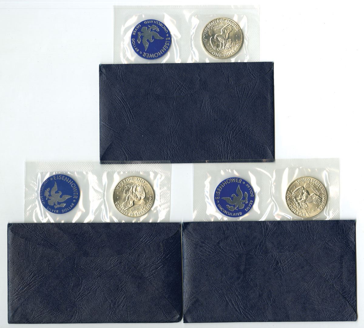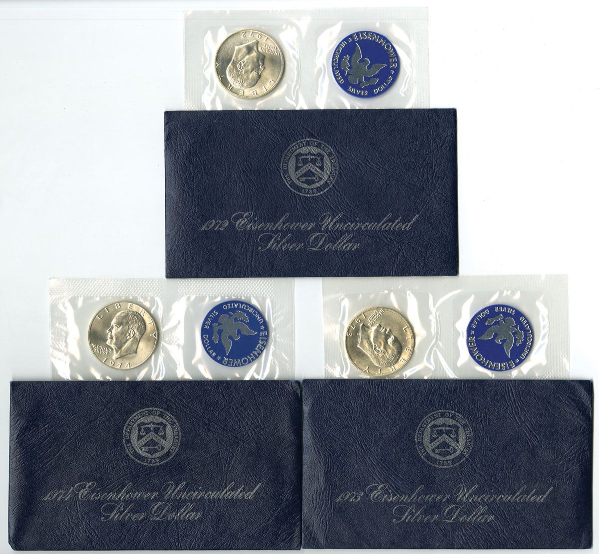 U.S., 1972, 1973, and 1974. Lot of 3 Eisenhower Uncirculated Silver Dollar Sets - 1972-S, 1973-S, and 1974-S, All are in Original Packaging with Certificates of Authenticity, Each coin contains .3161 oz. of Silver (40%), Coins are Uncirculated condition. (3).