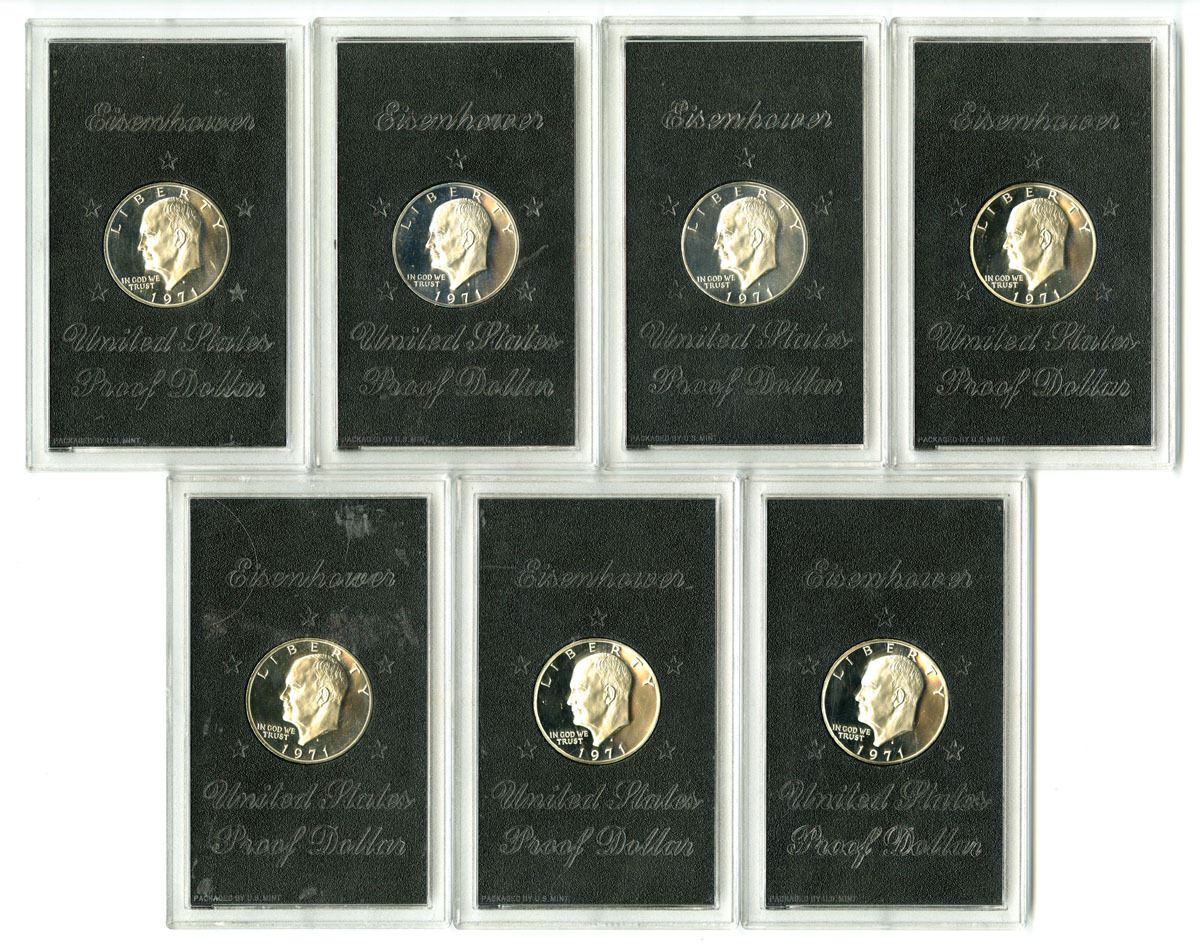 Washington D.C., 1971. Lot of 7, $1 Eisenhower Proof Dollars in Cases, UNC to Gem UNC condition. (7). Sold "AS IS" no returns accepted.