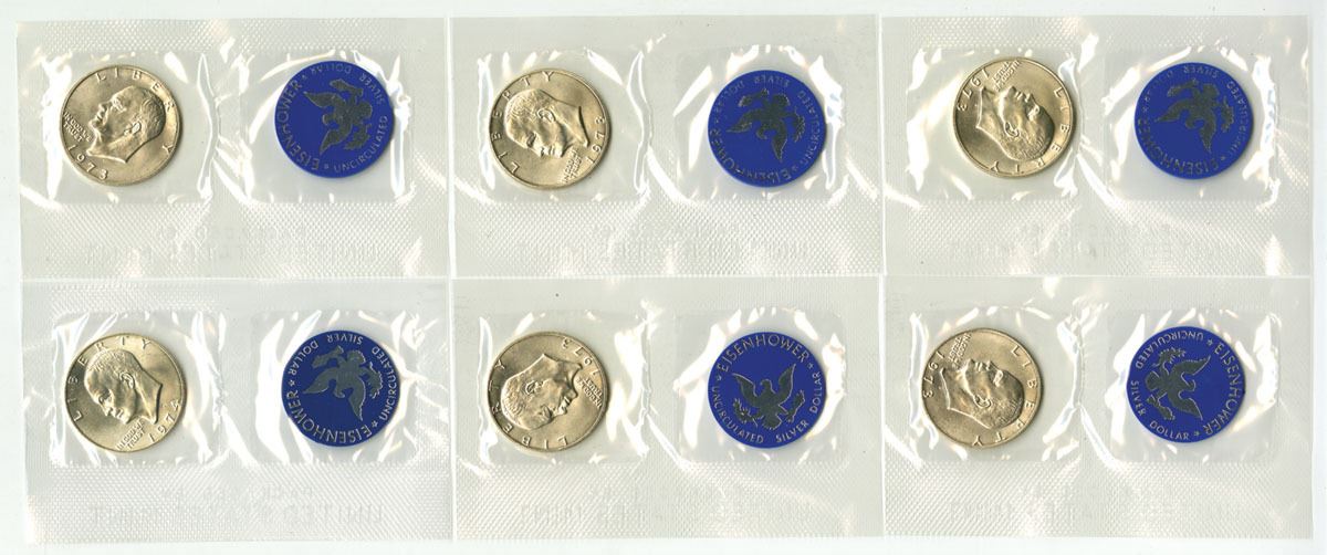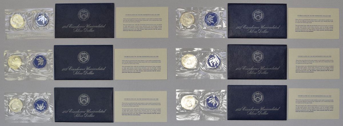 U.S., 1973-74. Lot of 6 Uncirculated Eisenhower Silver Dollars, from 1973 (5) and 1974, all housed in original U.S. Mint packaging with envelopes and inserts. Struck in 40% silver composition. Number of coins: 6; grams per coin: 24.59 grams; silver fineness: .400; total grams (all coins): 147.54 grams; ASW weight (fineness × weight): 59.02 grams (1.897 troy oz). (6). Sold “AS IS” no returns accepted.