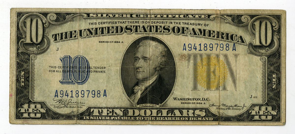 U.S. Emergency Issue - North Africa. $10, P-415Y, Series of 1934A, Fr# 2309, Black printing with Alexander Hamilton at center, Yellow seal at right and blue '10' at left, Back is green with Treasury Building at center, Issued for Military use in North Africa, Julian | Morgenthau Signatures, S/N A94189798A pp J163/855, VF condition.
