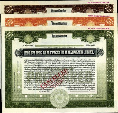 ca.1900-1920's. Odd Shs. 3 different specimen stocks. All different colors and classes. Scarce railroad certificates. XF condition. Red "Cancelled - Security Bank Note Co" and "Not to be Removed From File" overprinted on upper right corner and POC's. No vignettes. Unlisted railroad in Cox. SBNC.