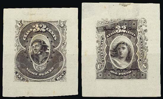 2 different proofs printed on india paper. 1. Class 32 cents. 8 0unces. Black. Numeral "8" as part of the design with small vignette of sailor smoking pipe; 2. Class 32 cents. 1 Pound. Black. Numeral "1" withsmall vignette of allegorical woman. Small faults thins from removal from previous mounting. Rare Revenue essays. Either ABNC, NBNC or CBNC item. Scarce and attractive.