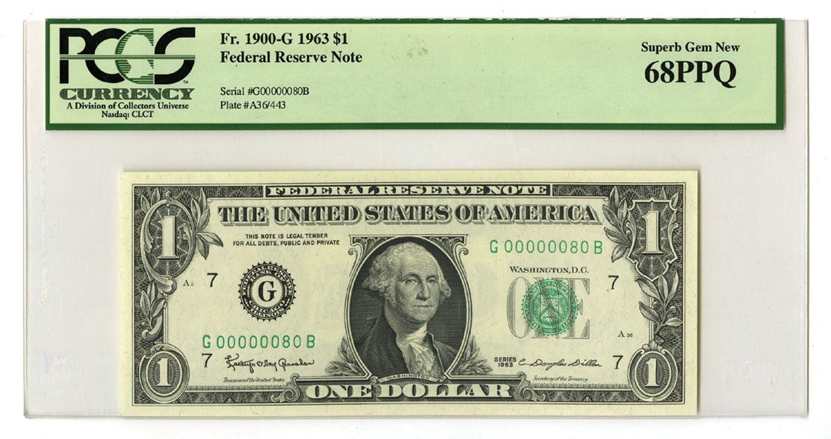 Chicago, Illinois, 1963. $1, Fr.# 1900-G, Series 1963, Issued Federal Reserve Note, Granahan | Dillon Signatures, Green seal at right, S/N G00000080B pp A36/443, PCGS graded Superb Gem New 68PPQ.