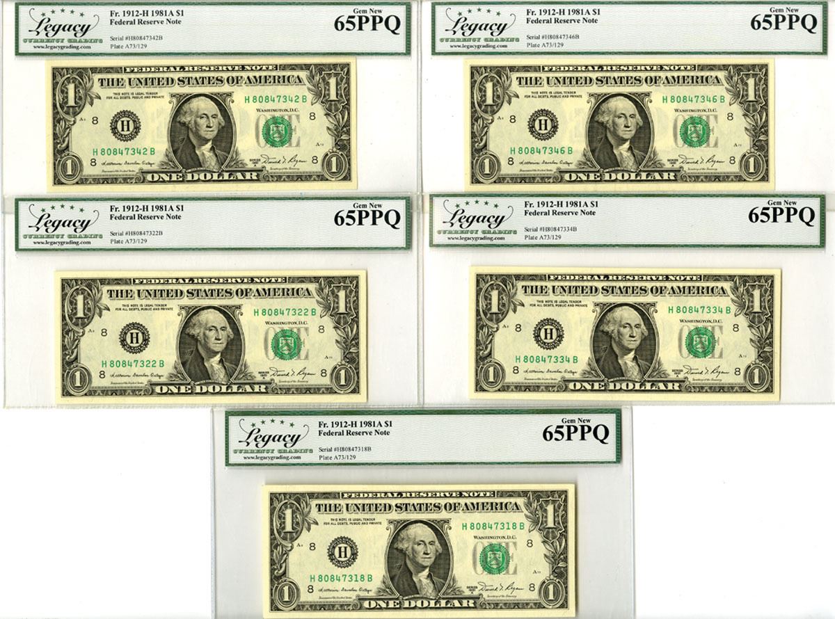 St. Louis, Missouri, 1981. $1, Series 1981A, Fr.# 1912-H (5), Group of 5 Issued Federal Reserve Banknotes, Green seals at right, Ortega | Regan signatures, All notes are LGC graded Gem New 65PPQ (5). Sold "AS IS" no returns accepted.