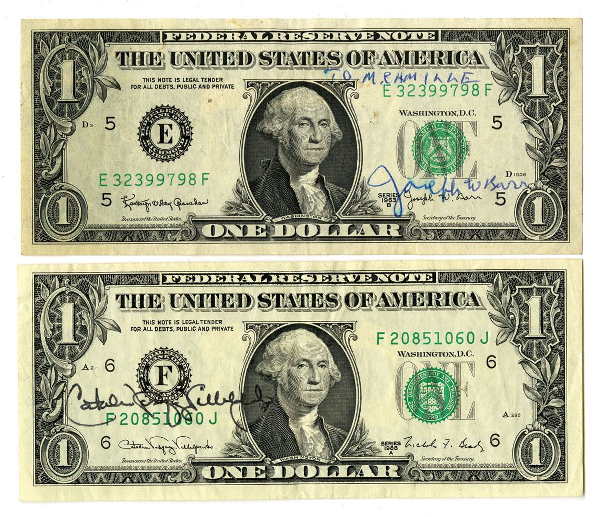 Georgia & Virginia, 1963 to 1988. Lot of 2 Issued Federal Reserve Notes: Richmond District, $1, Series 196B, Fr.# 1902E, Granahan | Barr signatures with Courtesy Barr autograph; and, Atlanta District, $1, Series 1988A, Fr.# 1915F, Villalpando | Brady signatures with Courtesy Villalpando autograph. Both are in Choice XF to AU condition. (2).