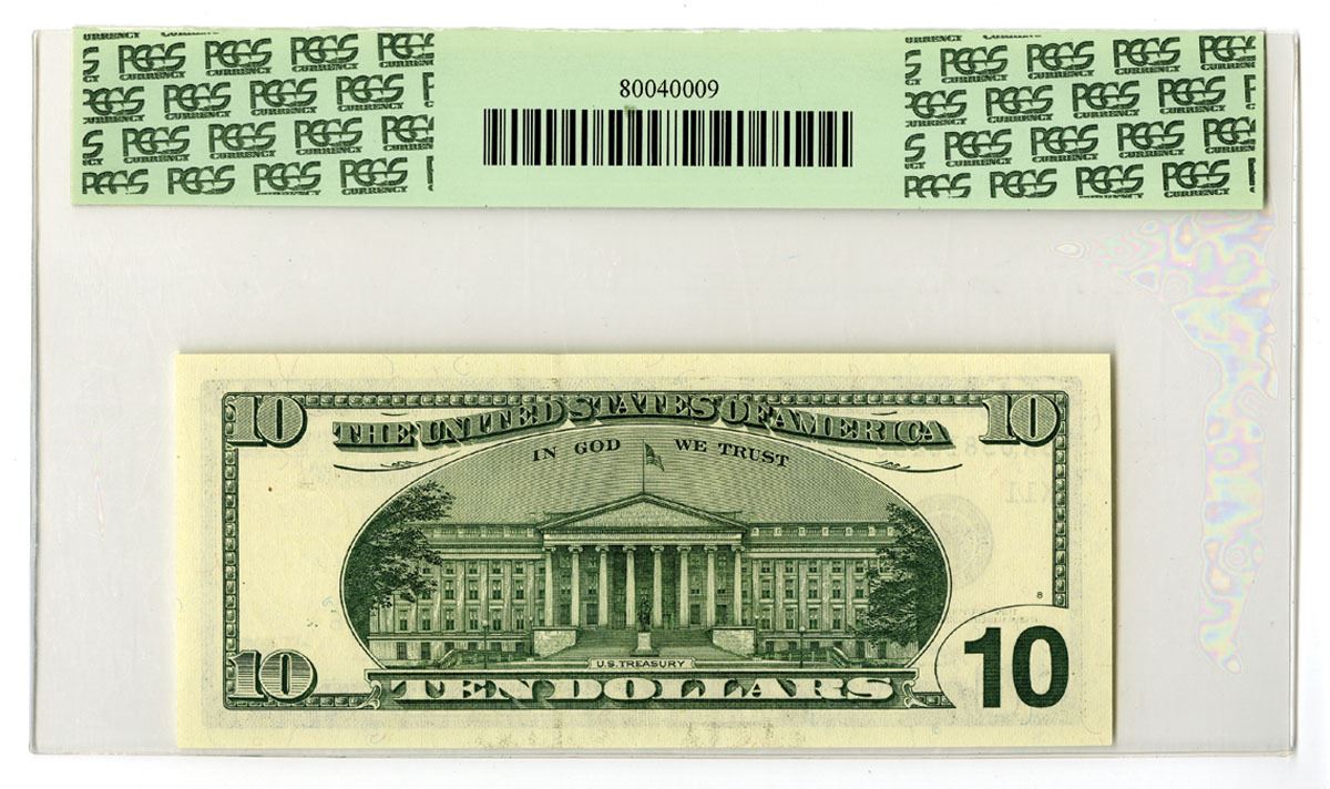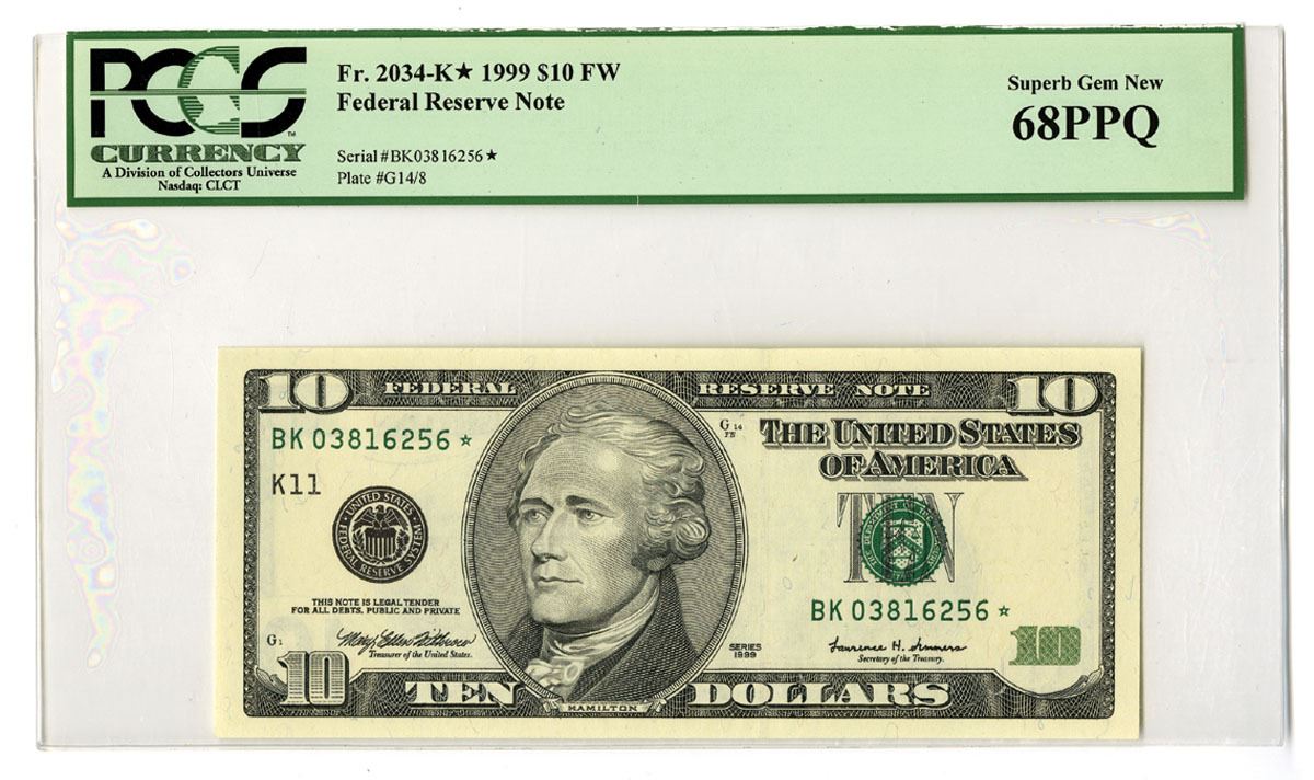 Boston, MA., Series 1999, $10, Fr.#2034-K*, FW District, S/N BK 03816256*, PCGS graded Superb Gem New 68 PPQ. Attractive note with 4 large even margins and sharp corners rarely seen this nice.