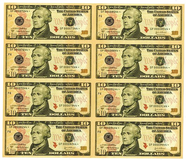 Washington, D.C., Federal Reserve Notes 2004 Series. Large uncut sheet of 8, $10 bills in gray-back with red underprint, featuring Alexander Hamilton on face, U.S. Treasury Building at back. Part of a series to make American currency more secure, includes a watermark, color-shifting ink, microprint, and security thread among other innovations. S/N's GF 00007344* to GF 00009444*, All In Choice to Gem Uncirculated condition, BEP, 8 pieces in 1 sheet.