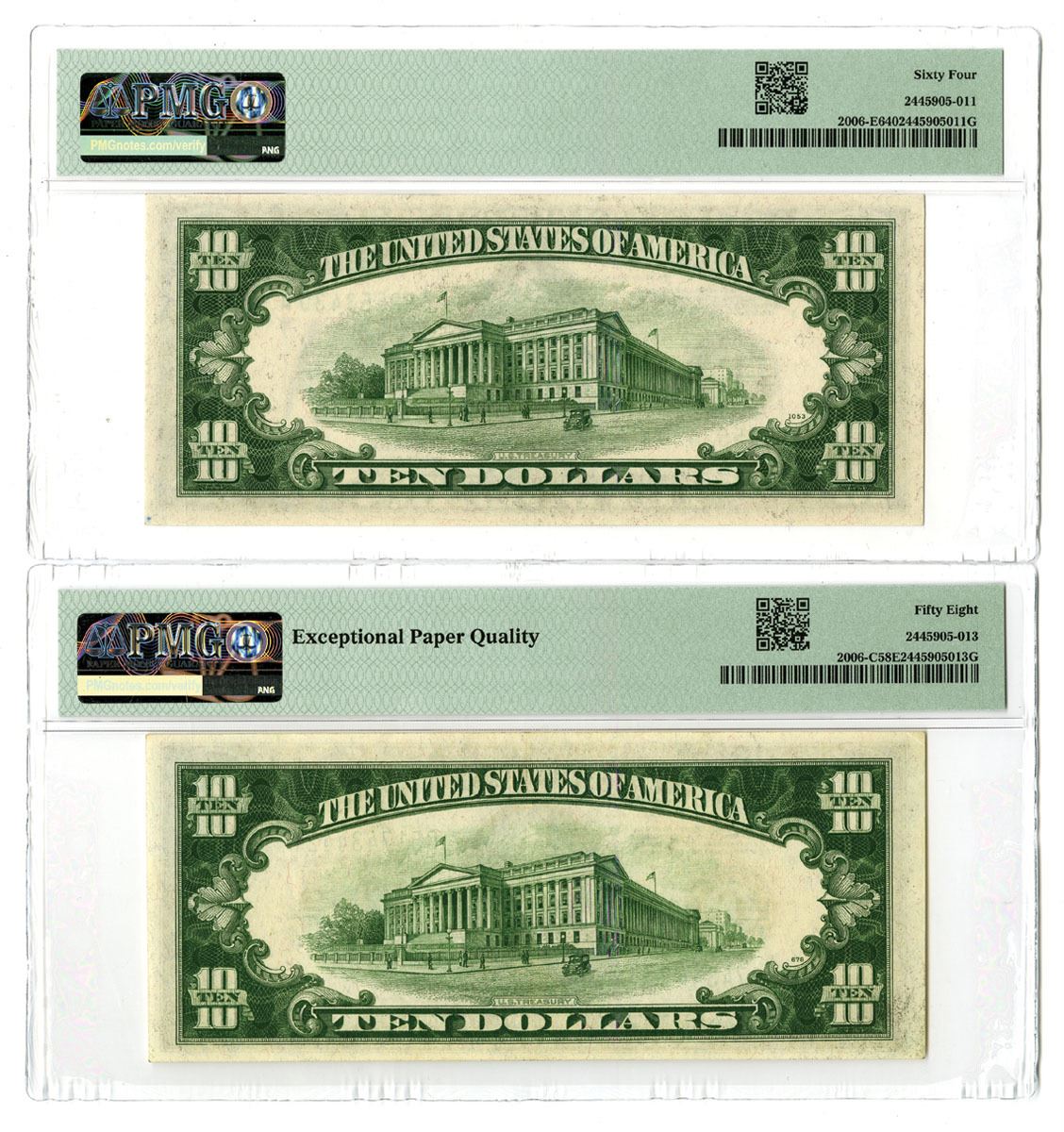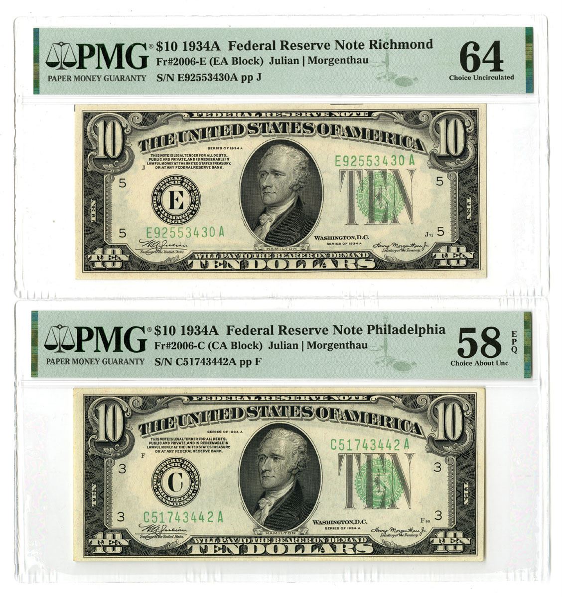 Pennsylvania & Virginia, 1934. Lot of 2 Issued Banknotes, Includes: $10, Series of 1934A, Fr.#2006-C, CA Block, Julian | Morgenthau signatures, S/N C51743442A pp F, PMG graded Choice About Uncirculated 58 EPQ; $10, Series of 1934A, Fr.#2006-E, EA Block, Julian | Morgenthau signatures, S/N E92553430A pp J, PMG graded Choice Uncirculated 64. (2). Sold "AS IS" no returns accepted.