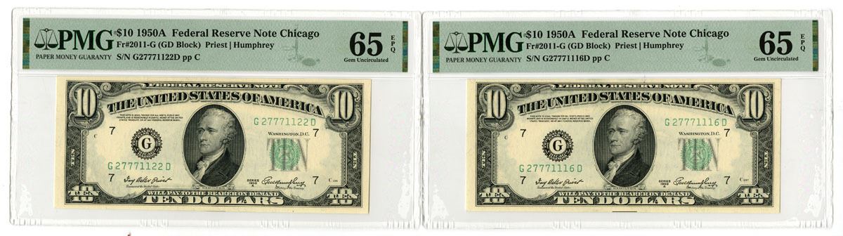 Chicago, Illinois, 1950. $10, Series of 1950A. Both Chicago District. Fr.# 2011-G (2), GD Block, Issued FRN Banknote Pair, Green seal at right, Priest | Humphrey signatures, S/Ns G27771116D pp C and G27771122D pp C, Both are PMG graded Gem Uncirculated 65 EPQ. (2). Sold "AS IS" no returns accepted.