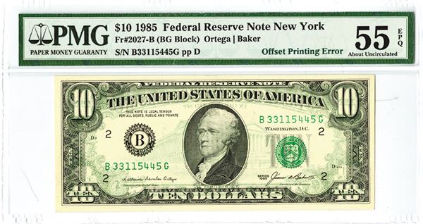 Federal Reserve Note Error, $10,The face has a light offset of the back, PMG graded About Uncirculated 55 EPQ.