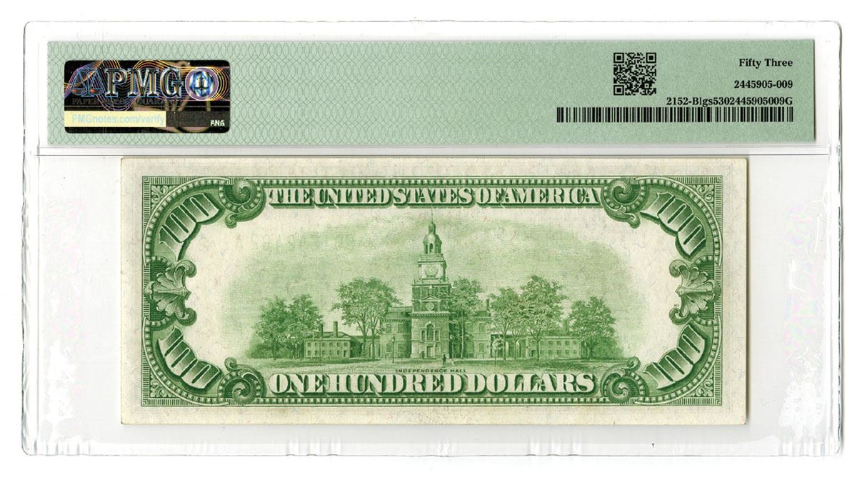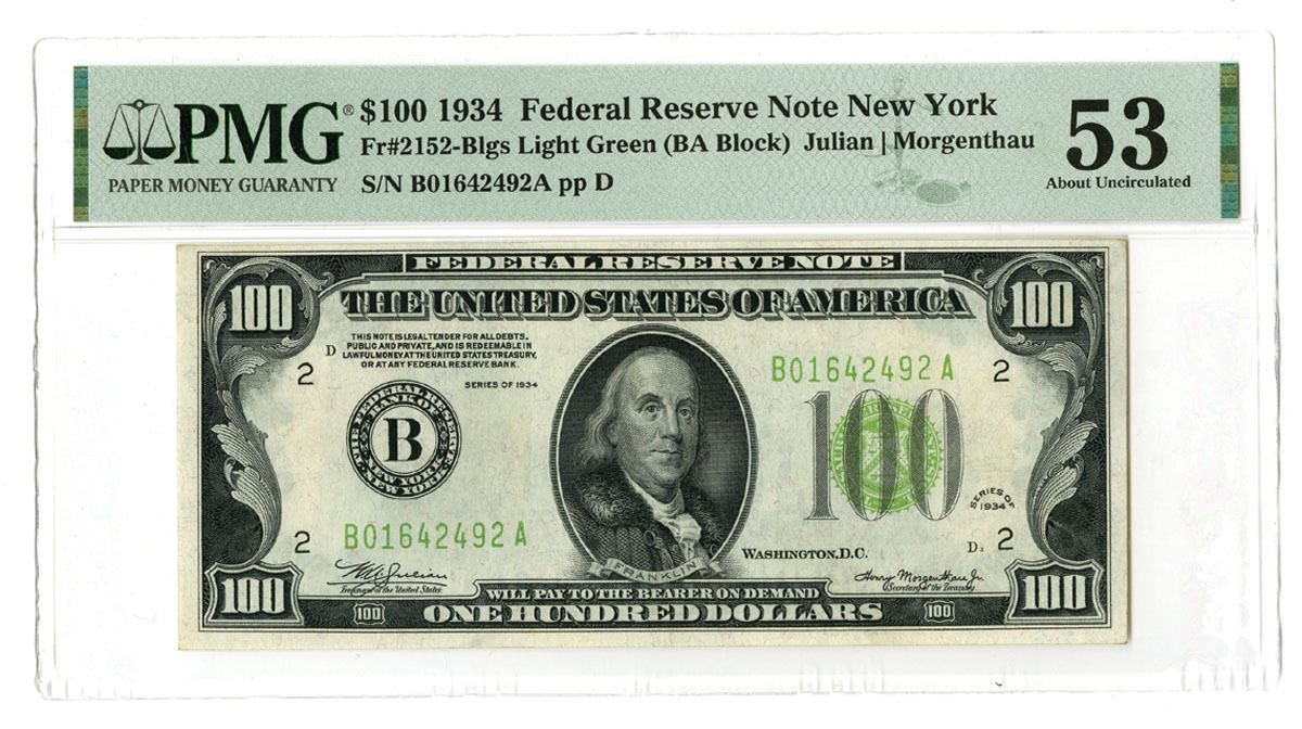 New York, New York, 1934. $100, Series of 1934, Fr.# 2152-Blgs, BA Block, Issued FRN Banknote, Light green seal at right, Julian | Morgenthau signatures, S/N B01642492A pp D, PMG graded About Uncirculated 53.