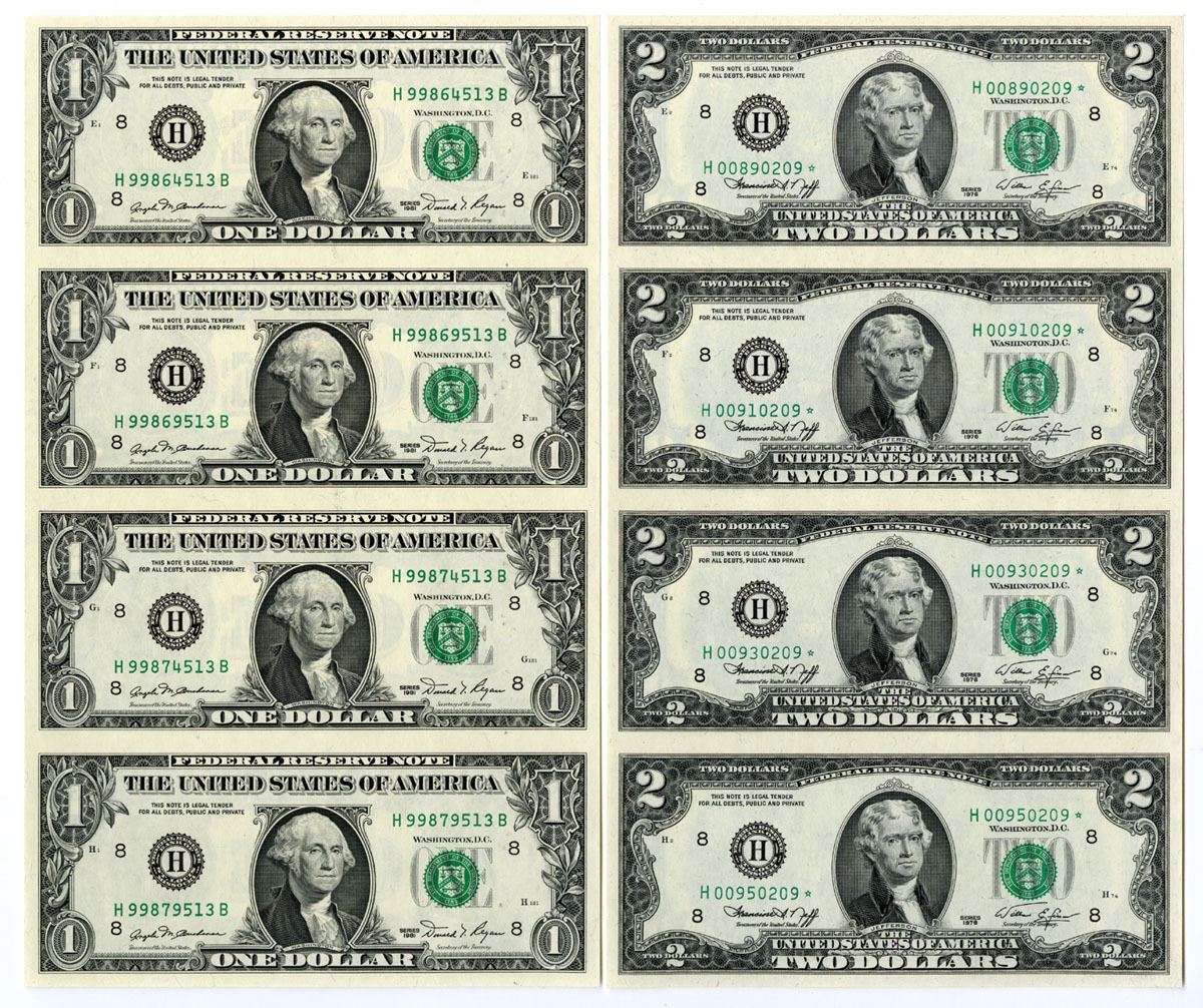 Lot of 2 Uncut Sheets of 4 Banknotes Each, Includes: $2, Series 1976, Fr.# 1935-H*, Neff | Simon signatures; $1, Series 1981, Fr.# 1911-H, Buchana | Regan signatures. Sheets range from UNC to Gem UNC condition. (2 Sheets or 8 Banknotes). Sold "AS IS" no returns accepted.