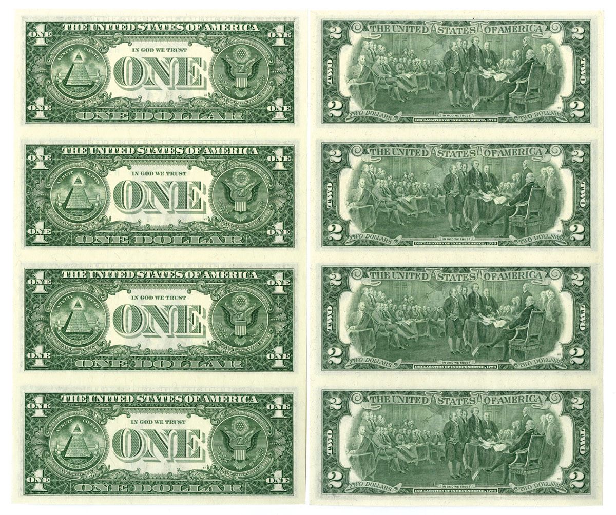 Lot of 2 Uncut Sheets of 4 Banknotes Each, Includes: $2, Series 1976, Fr.# 1935-H*, Neff | Simon signatures; $1, Series 1981, Fr.# 1911-H, Buchana | Regan signatures. Sheets range from UNC to Gem UNC condition. (2 Sheets or 8 Banknotes). Sold "AS IS" no returns accepted.