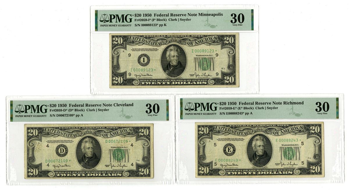 Various States, 1950. Lot of 3 Series 1950 Issued Banknotes, Includes: Cleveland, OH, $20, Fr.# 2059-D*, D* Block, S/N D00672109* pp A; Richmond, VA, $20, Fr.# 2059-E*, E* Block, S/N E00088243* pp A; Minneapolis, MN, $20, Fr.# 2059-I*, I* Block, S/N I00089123* pp K. All have Clark | Snyder signatures and are PMG graded Very Fine 30. (3). Sold "AS IS" no returns accepted.