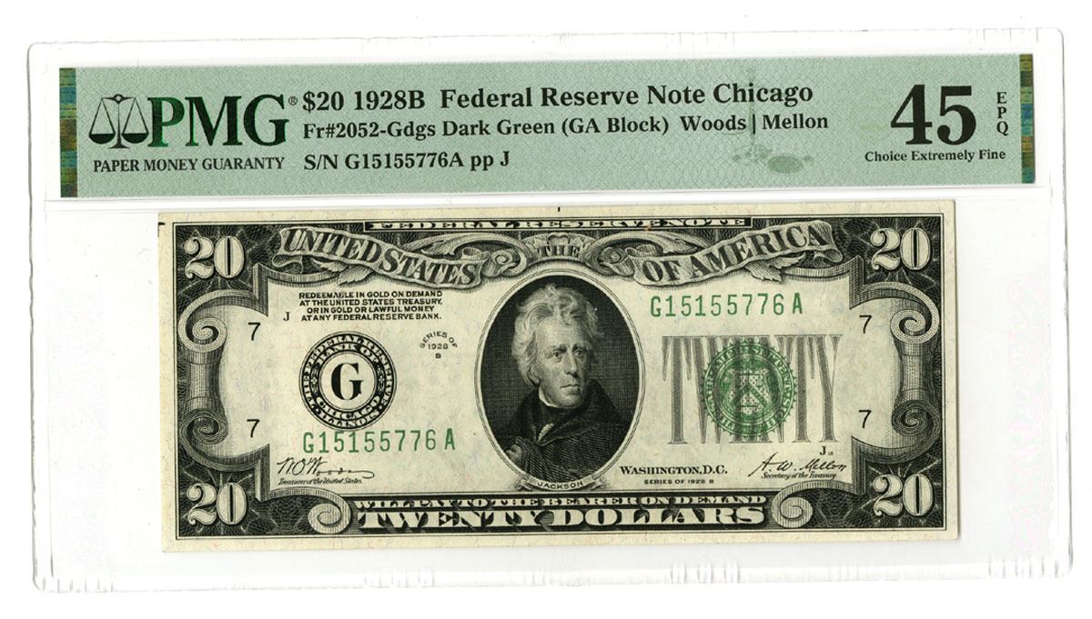 Chicago, Illinois, 1928. $20, Series of 1928B, Fr.# 2052Gdgs, Dark Green (GA Block) Issued Banknote, Woods | Mellon Signatures, Small green seal at right, S/N G15155776A pp J, PMG graded Choice Extremely Fine 45 EPQ.