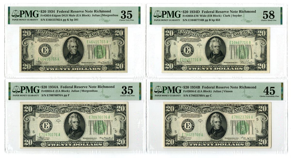 Richmond, Virginia, 1934. Lot of 4 Issued Federal Reserve Notes, All Richmond, VA. District. Includes: $20, Series of 1934, Fr.# 2054Edgsm DGS Mule, Julian | Morgenthau Signatures, PMG Choice Very Fine 35; $20, Series of 1934A, Fr.# 2055E, Julian | Morgenthau Signatures, PMG Choice Very Fine 35; $20, Series of 1934B, Fr.# 2056E, Julian | Vinson Signatures, PMG Choice Extremely Fine 45; $20, Series of 1934D, Fr.# 2058EW Wide, Clark | Snyder Signatures, PMG Choice About Unc 58. (4). Sold "AS IS" no returns accepted.