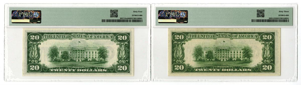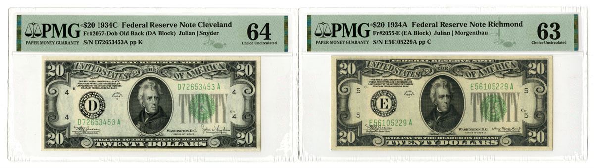 Richmond and Ohio Districts, 1934. Lot of 2 Issued Federal Reserve Notes, Includes: Richmond, VA, Series of 1934A, $20, Fr.#2055E, Julian | Morgenthau signatures, PMG Choice Uncirculated 63; Cleveland OH, Series of 1934C, $20, Fr.#2057-Dob Old Back, Julian | Snyder signatures, PMG Choice Uncirculated 64. (2). Sold "AS IS" no returns accepted.