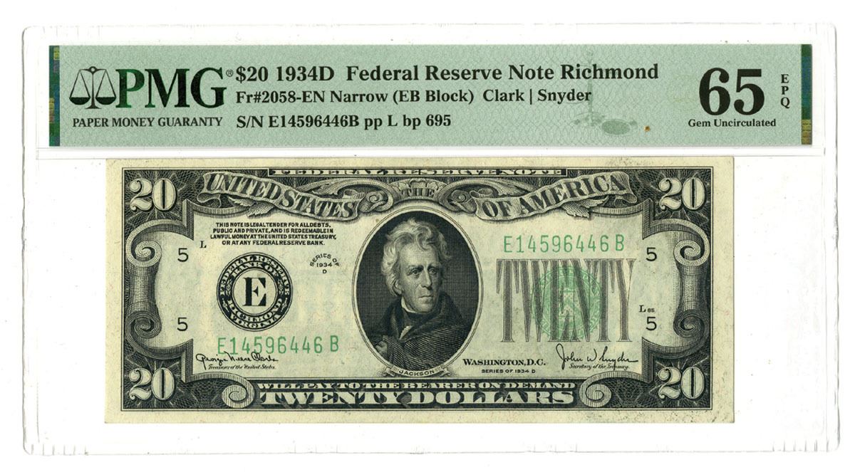 Richmond, Virginia, 1934. $20, Series of 1934D, Fr.# 2058EN Narrow, (EB Block) Issued Banknote, Clark | Snyder Signatures, Small green seal at right, S/N E14596446B pp L bp 695, PMG graded Gem Uncirculated 65 EPQ.