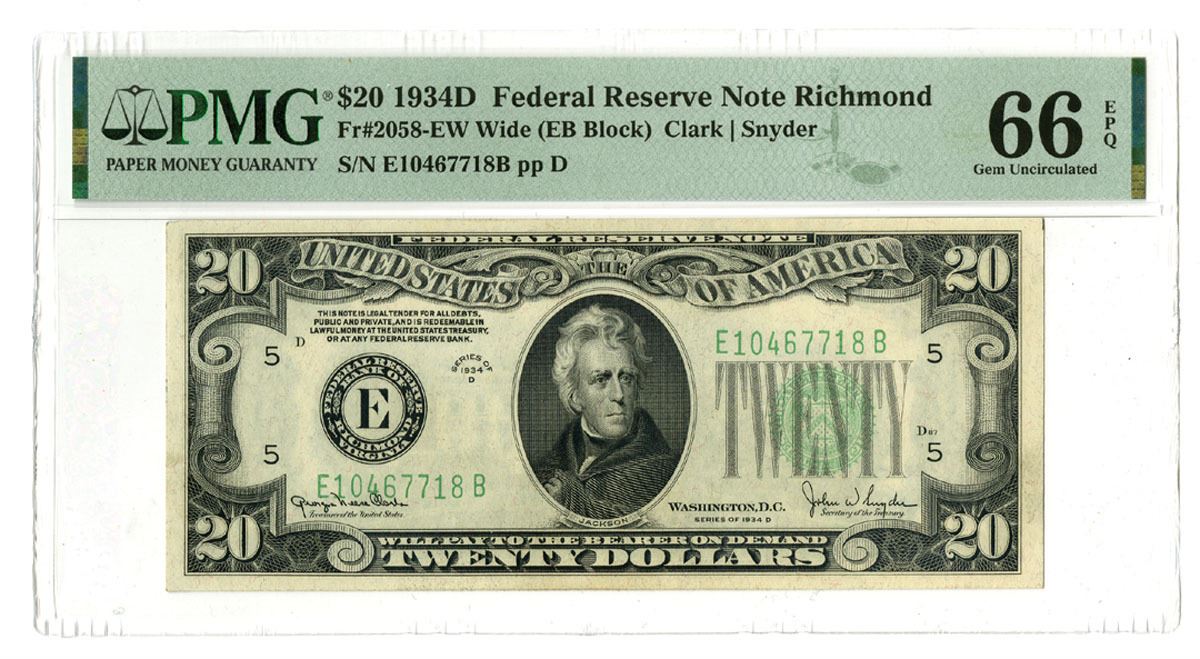Richmond, Virginia, 1934. $20, Series of 1934D, Fr.# 2058EW Wide, (EB Block) Issued Banknote, Clark | Snyder Signatures, Small green seal at right, S/N E10467718B pp D, PMG graded Gem Uncirculated 66 EPQ.