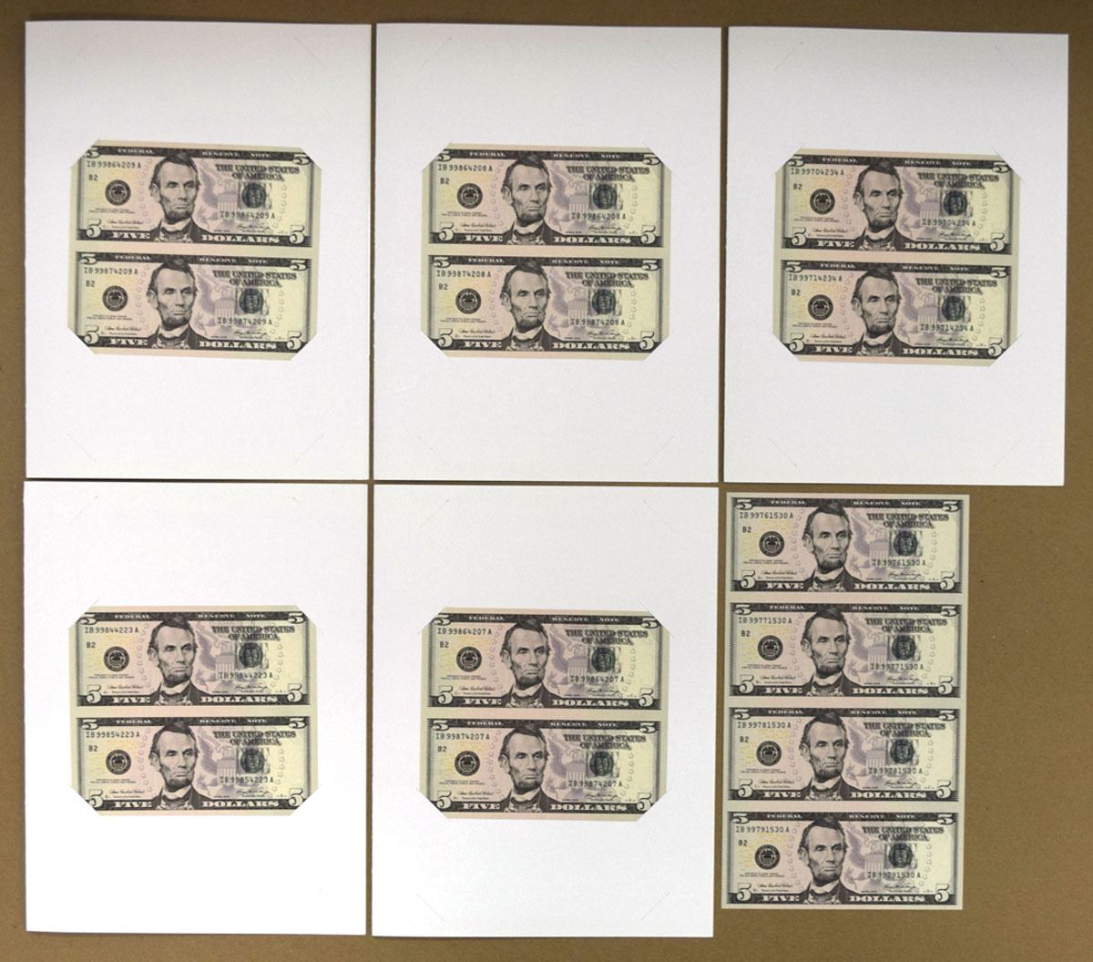 Lot of 6 Uncut Sheets of $5 Banknotes, Includes: $5 FW, Series 2006, Fr.# 1996-B Uncut Sheet of 4 Notes; $5 FW, Series 2006, Fr.# 1996-B Uncut Sheet of 2 Notes in Original Packaging from BEP (5). Banknotes range from UNC to Gem UNC condition. (6 Sheets of 14 Banknotes, with $70 FV). Sold "AS IS" no returns accepted.