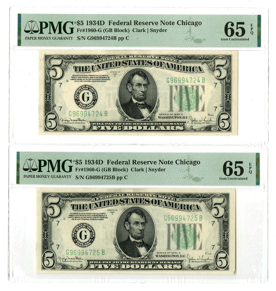 Chicago, Illinois, 1934. $5, Series of 1934D, Fr.# 1960G (2), GB Block, Sequential Pair of Issued Banknotes, Clark | Snyder Signatures, Small green seals at right, S/Ns G96994724B pp C and G96994725B pp C, Both notes are PMG graded Gem Uncirculated 65 EPQ. (2). Sold "AS IS" no returns accepted.