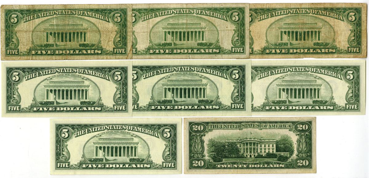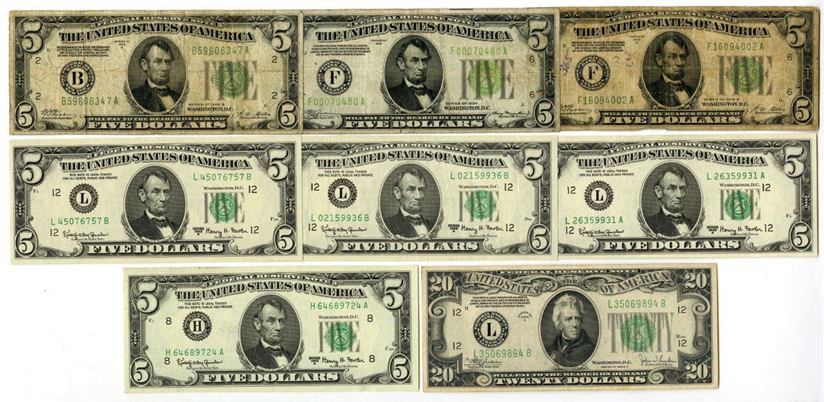 Washington D.C., 1928-63. Lot of 8 Issued Federal Reserve Notes, Includes: $5, Series of 1928B (2), Fr.#1952B and Fr.#1952F; $5, Series of 1934, Fr.#1955F; $20, Series of 1934C, Fr.#2057L; $5, Series 1963A (4), Fr.#1968H and Fr.#1968L (3). Notes range from Fine to Uncirculated condition. ($55 FV), (8). Sold "AS IS" no returns accepted.