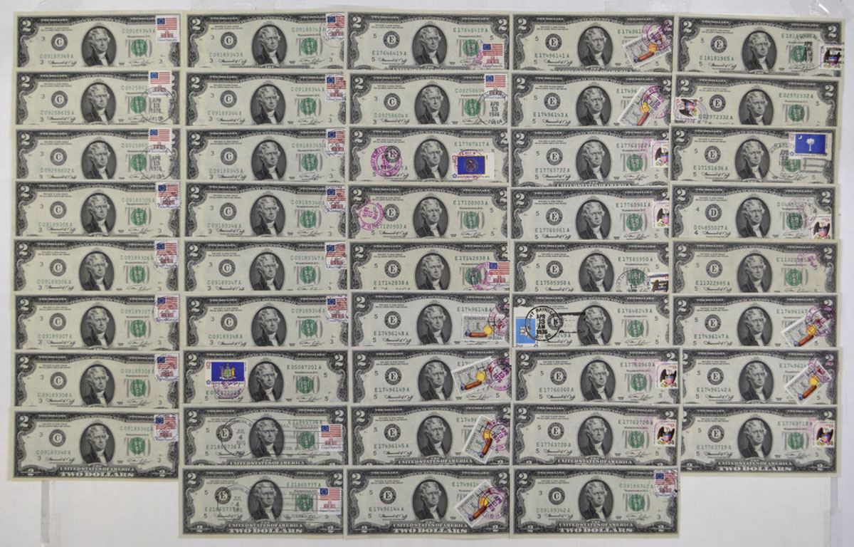 Washington D.C., Lot of 43, 1976. $2, Series 1976, Fr.#1935, First Day Stamped and Cancelled Federal Reserve Notes, Neff | Simon signatures, Stamps at top right corner, Notes are in Uncirculated condition. ($86 Face Value), (43). Sold "AS IS" no returns accepted.