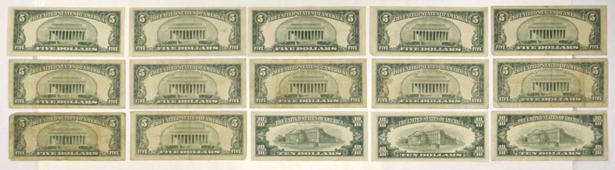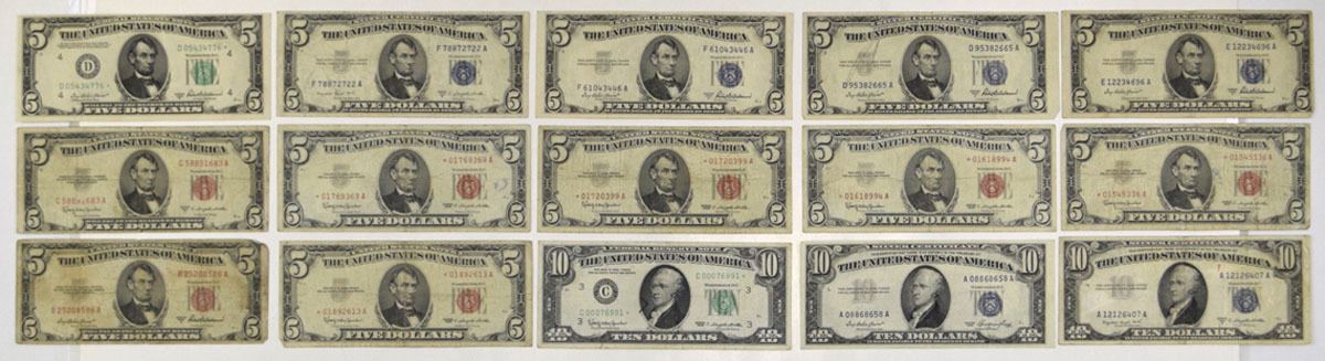 Washington D.C., 1950-63. Lot of 15 Federal Reserve, Silver Certificates, and Legal Tender Banknotes, Includes: Federal Reserve Notes, $5, Series 1950B, Fr.#1963D*, Replacement Note; $10, Series 1963, Fr.#2016C*, Replacement Note; Silver Certificates, $5, Series 1953A, Fr.#1656 (3); $5, Series 1953B, Fr.#1657; $10, Series 1953, Fr.#1706; $10, Series 1953B, Fr.#1708; Legal Tender Notes, $5, Series 1953A, Fr.#1533; $5, Series 1953C, Fr.#1535; and, $5, Legal Tender, Series 1963, Fr.#1536* Replacement notes, (5). Notes are in VF to VF condition. ($90 Face value for the group),(15). Sold "AS IS" no returns accepted.